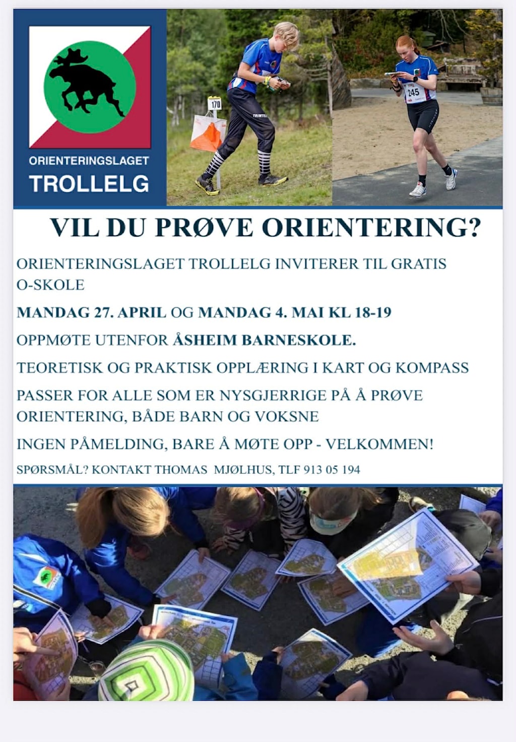 Orienteringslaget Trollelg arrangerer O- skole for nye løpere starter mandag 27. april på Åsheim Barneskole og tirsdag 28. april i Buvika! Det er de sammen kursene to forsjellige plasse og du kan velge hvor du vil delta!